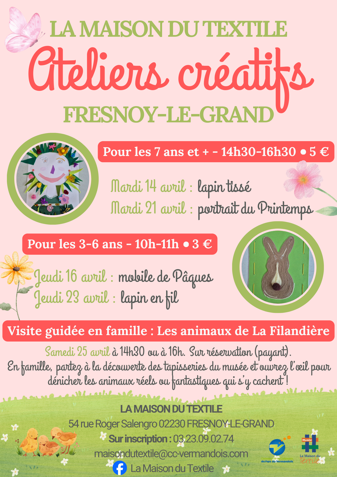 Pour les 7-12 ans, rendez-vous les mardis 14 et 21 avril de 14h30 à 16h30 avec respectivement le "Lapin Tissé" et "Portrait du Printemps" et pour les plus petits (3-6 ans), ça se passera les jeudis 16 et 23 avril de 10h à 11h avec "Mobile de Pâques" et "Lapin en fil" !