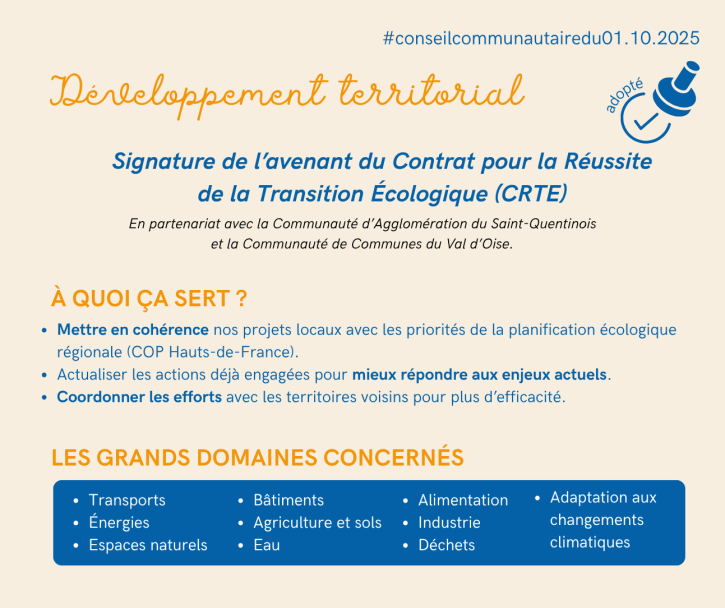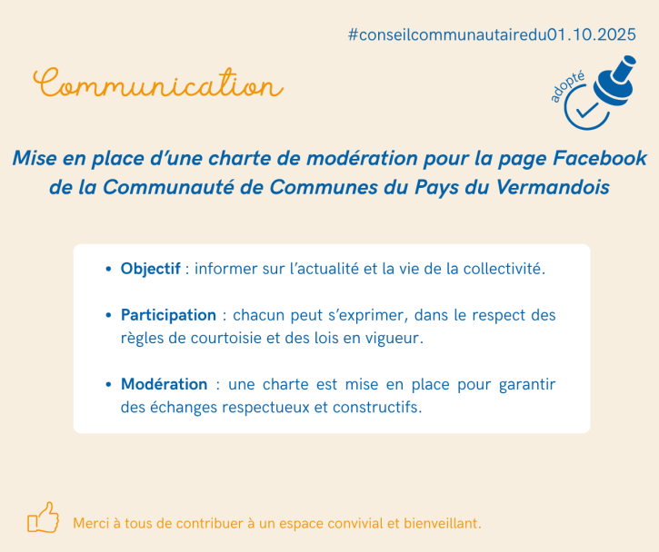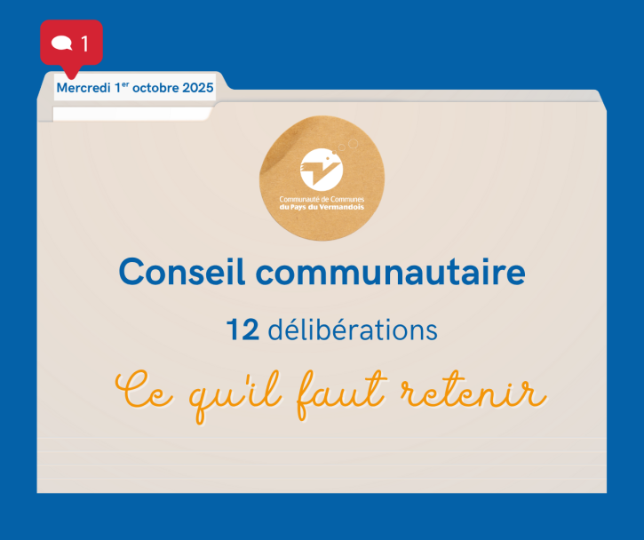 Le conseil communautaire est l'organe délibérant qui a la même fonction qu’un conseil municipal. Il règle par ses délibérations, les affaires qui sont de la compétence de la Communauté de Communes. Il est composé de représentants des 54 communes du Vermandois, appelés conseillers communautaires.